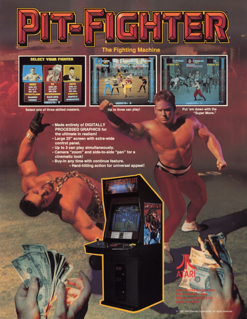 Pit Fighter llevó la idea gráfica de aquel juego y la mezcló con lo que estaba de moda por aquellos días: las películas de artes marciales con torneos ilegales con apuestas y público muy extraño de por medio.