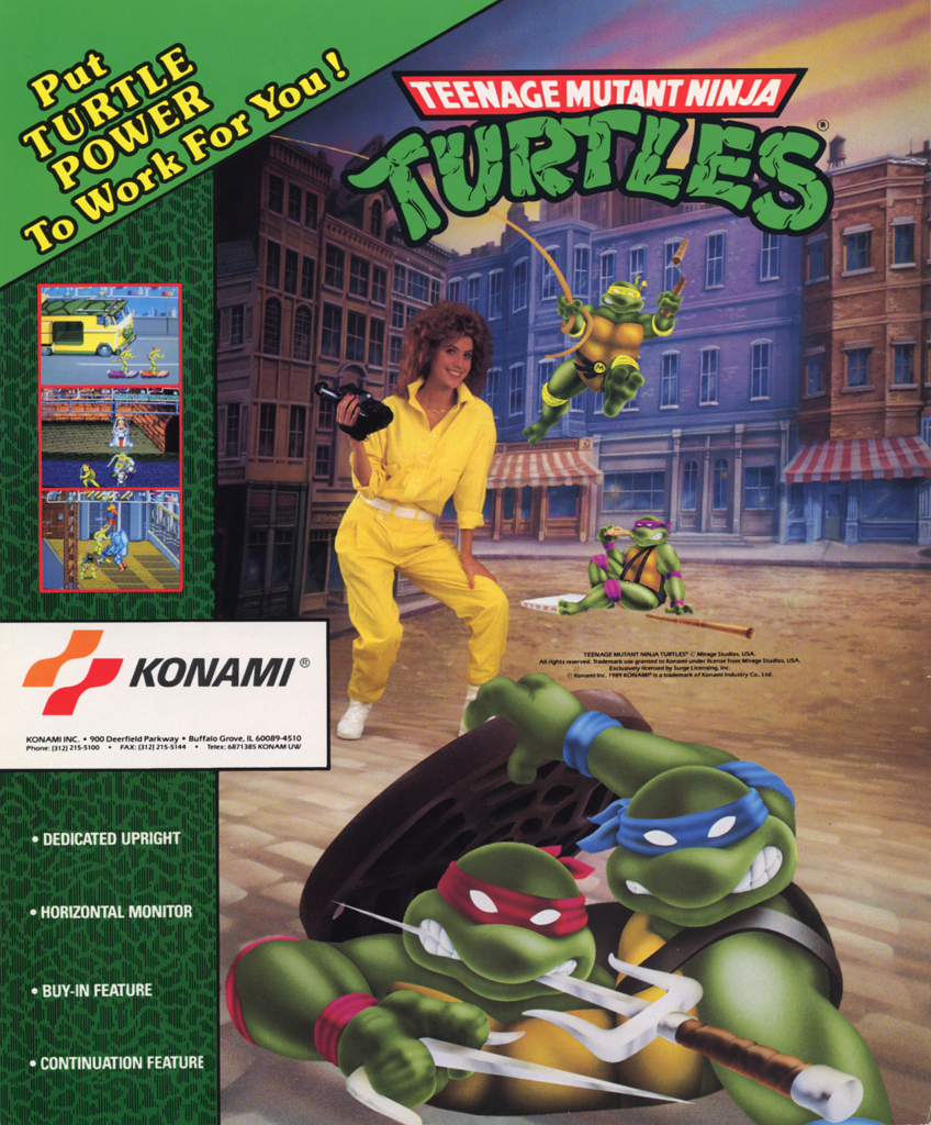 La japonesa Konami fue la encargada de llevar el primer título de los personajes a las recreativas y marcó el camino de los beat ‘em ups de cara al futuro. Según el manual de la adaptación del juego a la Nintendo NES, el título continúa directamente la historia desde el final de la primera película de las tortugas.