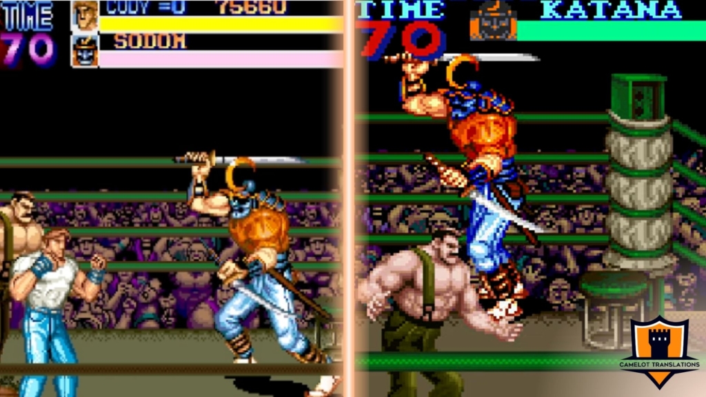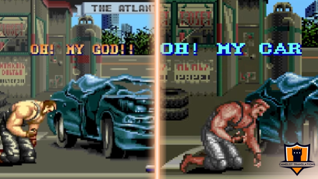 La primera fase de bonus del juego consiste en destruir un coche a golpes, al ver el desastre en el que queda su vehículo, uno de los enemigos se arrodillará llorando. En la versión japonesa y espetará un «Oh, my God!», sin embargo, en las versiones internacionales siempre vigilantes del qué dirán optaron por modificar esto por un tibio «Oh, my car!» que a pesar de que queda mucho más suave no requería cambios mayores ya que incluso la cadena de texto tiene la misma cantidad de caracteres.
